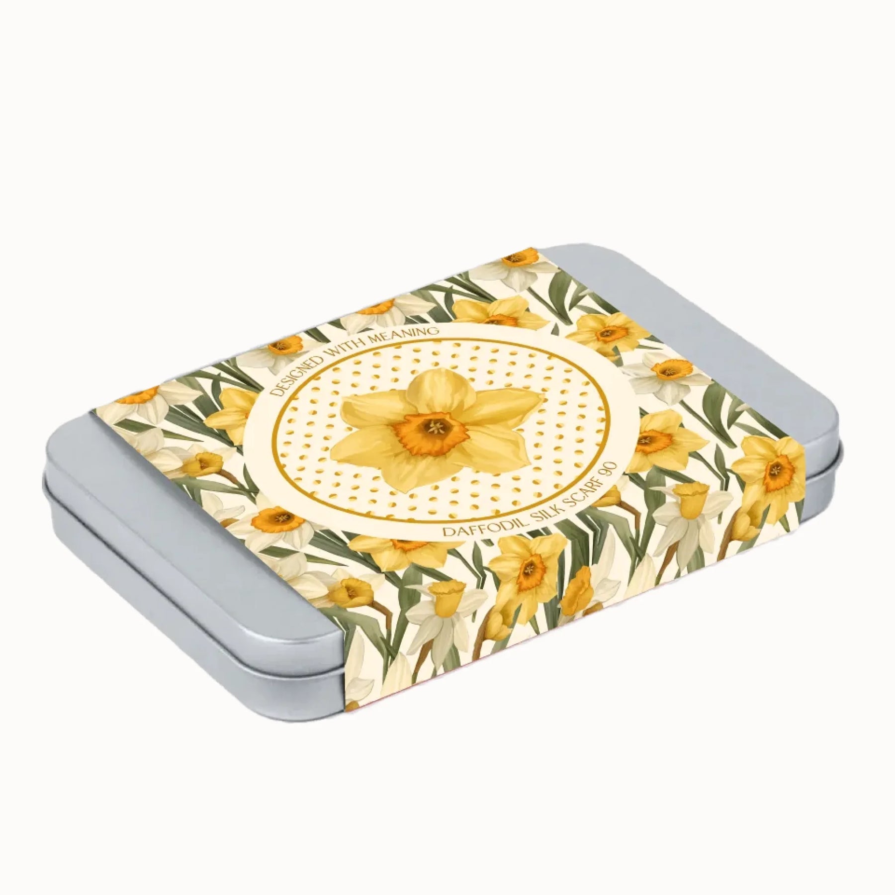 Finished by hand with a rolled hem, this 90cm square offers graceful movement and all-day wearability. Each scarf arrives in a reusable tin wrapped in coordinating daffodil artwork - ready for gifting, collecting, or cherishing.