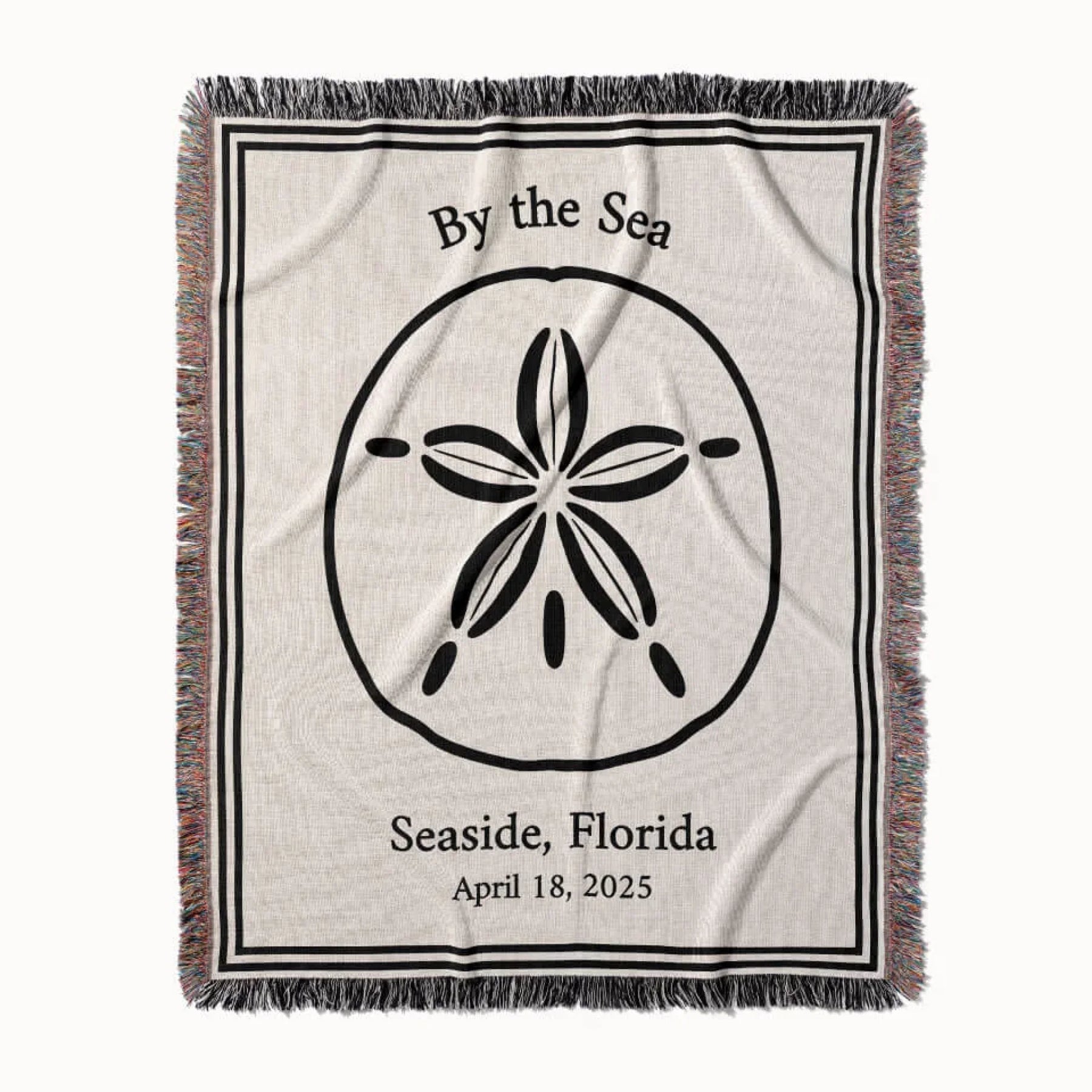 Woven from 100% dyed cotton, this heirloom-quality throw captures the feeling of salt-kissed breezes, barefoot days, and the timeless rhythm of the tides. At its center, a delicate sand dollar anchors the design - a symbol of renewal, peace, and the quiet treasures found by the shore.