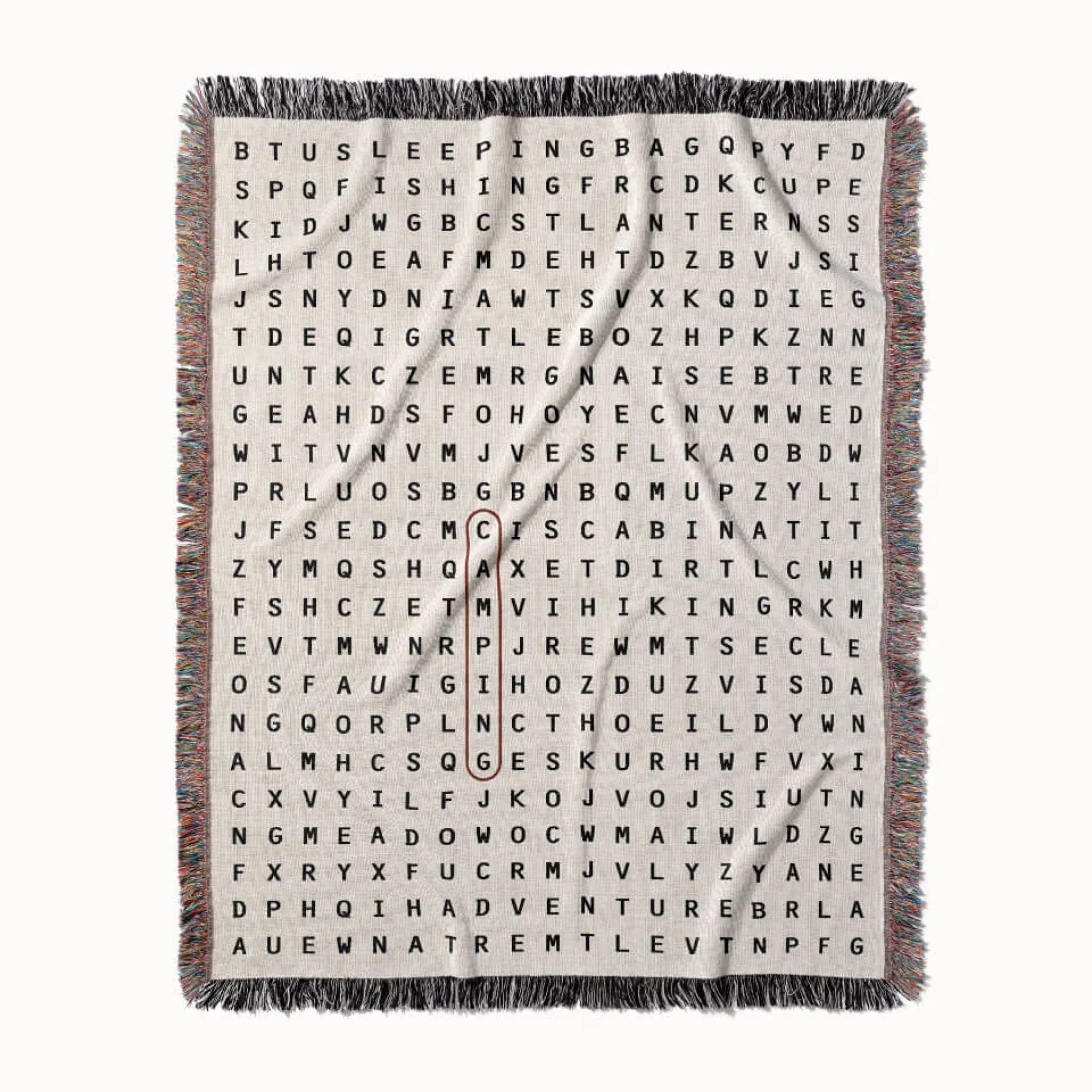 Wrap yourself in the magic of the great outdoors with this cozy woven throw, featuring a word search puzzle filled with camping essentials, traditions, and favorite moments by the fire.